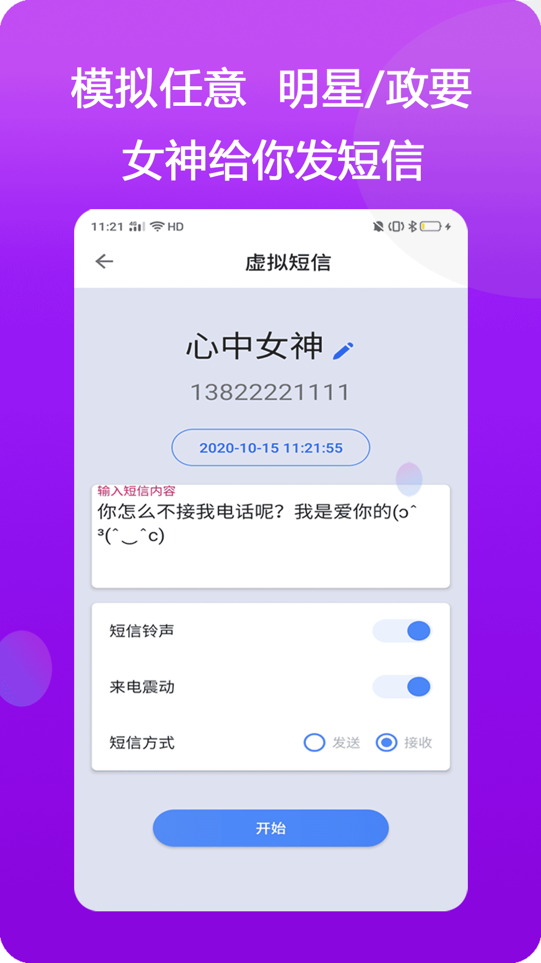 虛擬任意人、時(shí)間、歸屬地、號(hào)碼、通話(huà)聲音打來(lái)的電話(huà);還能虛擬來(lái)短信發(fā)短信等短信聊天哦